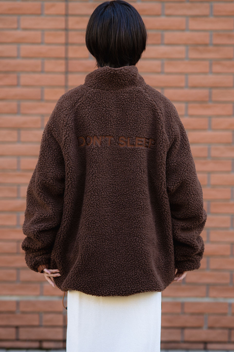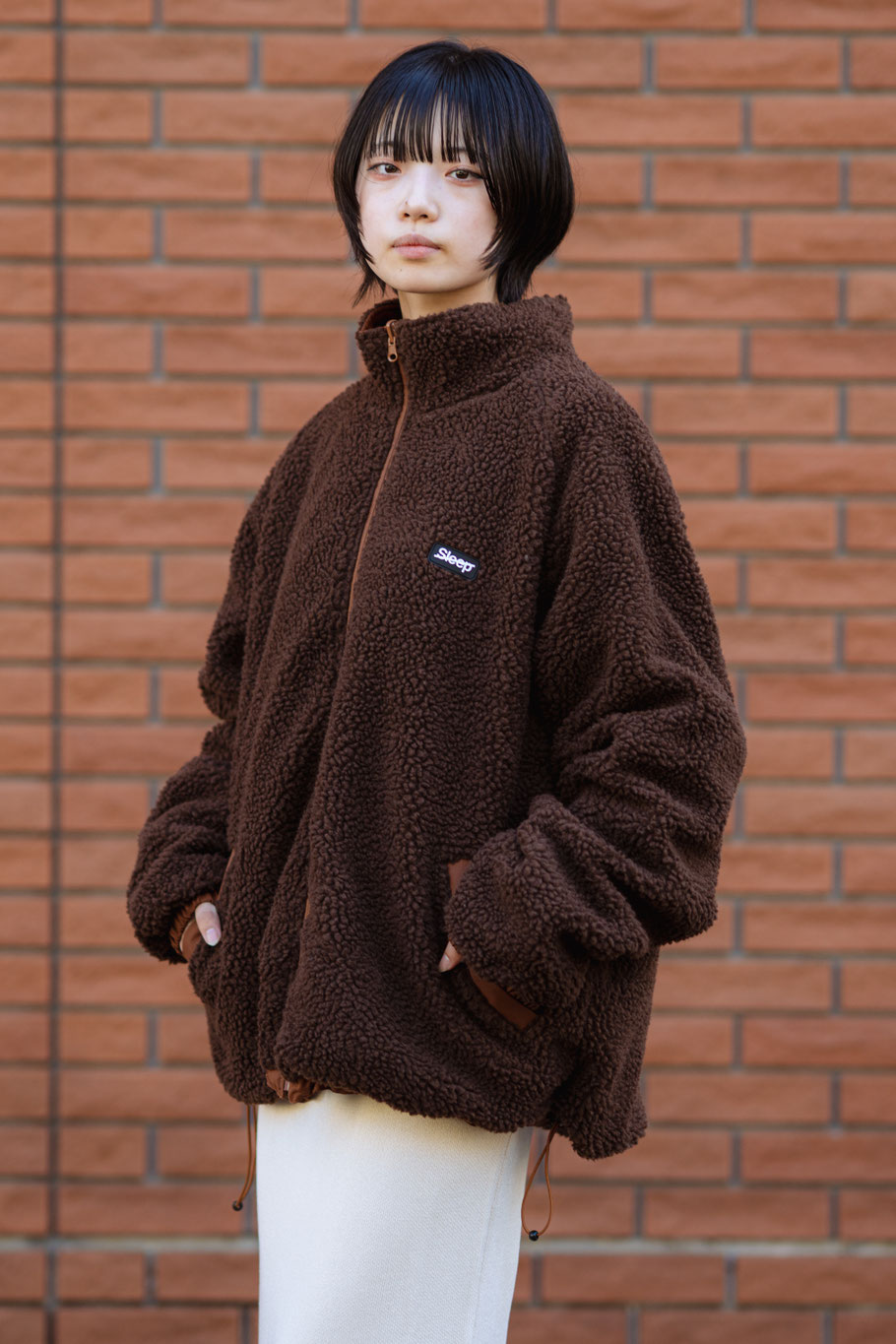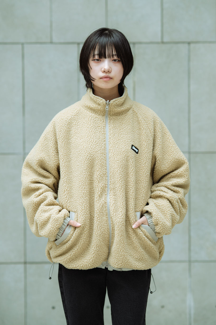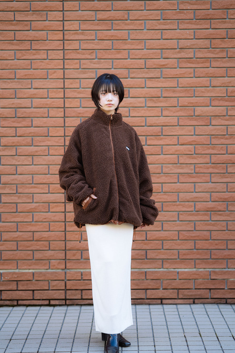 ボア面の背中には同色糸で光沢のある刺繍を施し、カジュアルな雰囲気に上品さをプラス。