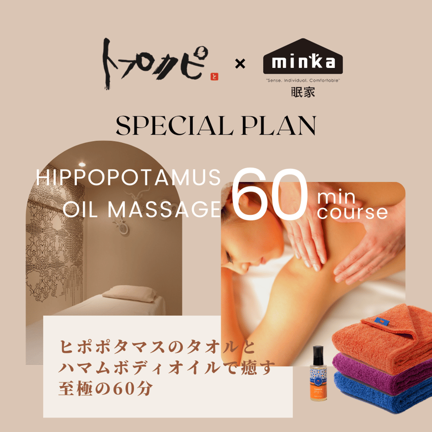 特典内容:エステサロン トプカピ×眠家 スペシャルプラン ヒポポタマス オイルマッサージ60分チケットプレゼント