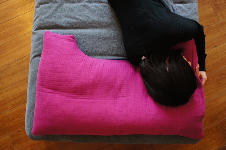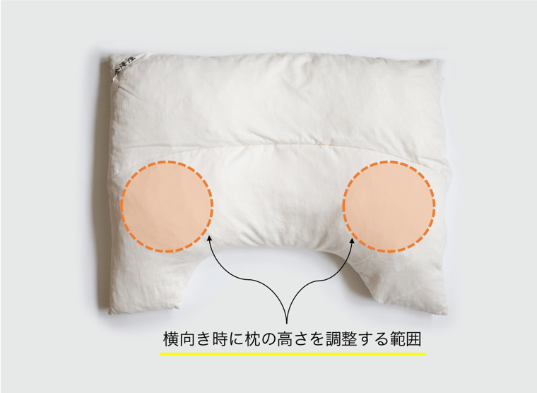 横向きの時は顔から首にかけて大きく隙間が生まれやすいので、仰向け時に後頭部がくる位置(先ほど仰向け時の高さを調節した範囲)よりは中わたの量は多くても構いません。