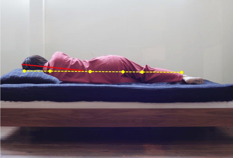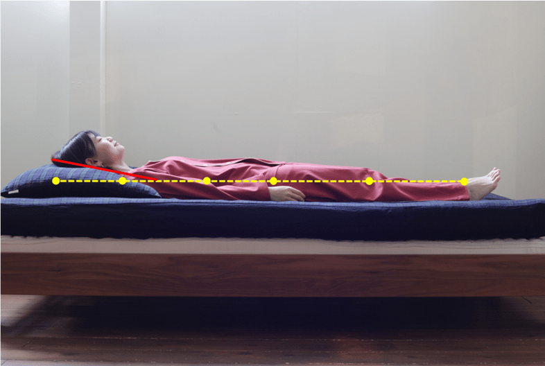 枕が高いため頭の位置だけではなく、上半身から頭にかけて体の線が斜め上に曲がっています。