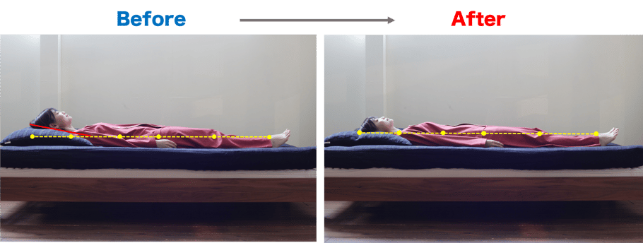 調整後の方が頭の先と肩の位置が一直線で安定した姿勢になっています。体とマットレスの隙間を枕が埋めてくれているので就寝中も違和感が少なく、翌朝首や肩に痛みも伴いにくくなります。