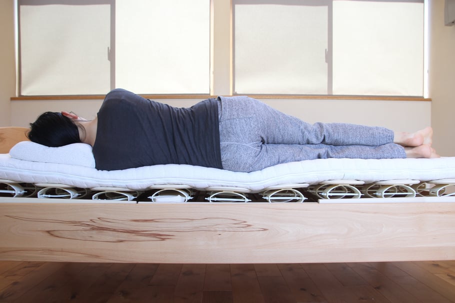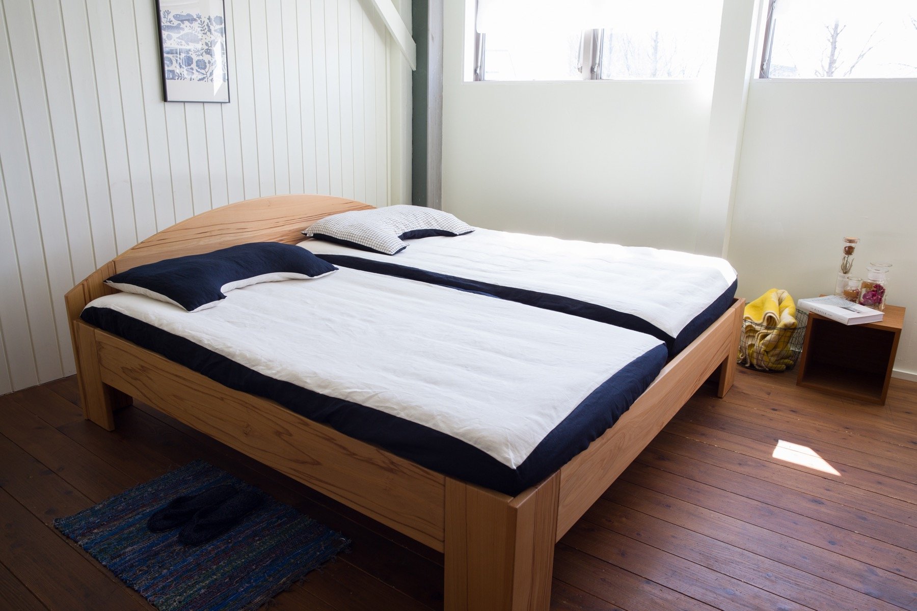 身体を支える「ブナ木盤」とクッションの弾力を変える「ラバークッション」とクッションの硬さを変える「ラバーピン」のコンビネーションのスプリング、ウール製ベッドパッド、ラテックスのマットレスを組み合わせた、眠家の代表的なベッドシステムをご用意しています。あらゆる身体の動きや重心に対応できる木盤が、どんな寝返りや寝姿勢にもうまく動いてくれるので、キレイな上体を作り出す究極のシステムです。普段、新潟のお店に来られない方にも「お試し寝」をしていただき、体験したことのない寝心地を感じていただければと思います。