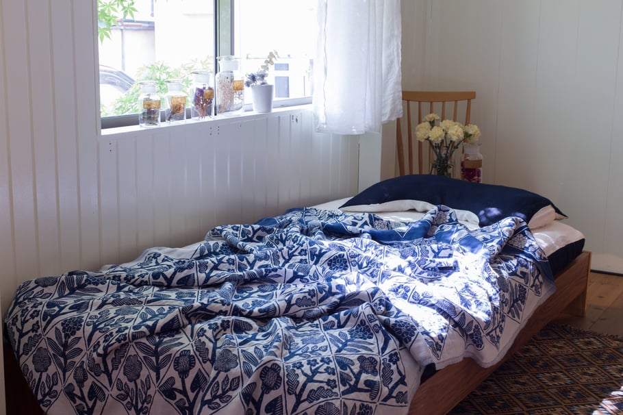 陶芸家の鹿児島睦さんデザインのテキスタイルが、独特の世界観を生み出している<ラプアンカンクリ>のブランケット。なんせ見た目が可愛らしいので、羽毛布団の上にバッとかけておくだけでも寝室の雰囲気を変えてくれる便利な一枚。洗いをかけた質の良いリネンとコットンでできた涼しいブランケットで、梅雨から真夏にかけては一枚でお使いいただくと良いでしょう。シングルサイズより一回り大きく、身体が外に出にくく大柄な方も足が出ません。絵柄は織りで表現しているので裏返すと色が反転します。