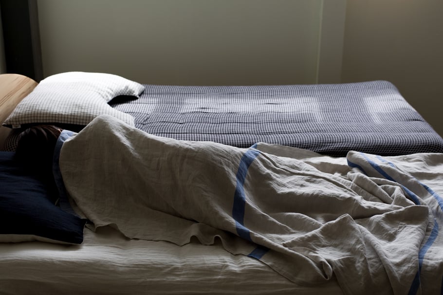 ひんやりとしたリネンならではの質感が夏にぴったりな大判ブランケット。こちらもシングルサイズより大きく、厚みのあるマットレスさえ包み込むことができるので、シーツにしている方も大勢いらっしゃるのですが、シーツとして使うと本当に気持ちが良いと評判です。クタッとしたリネンの肌沿いが夏にはちょうどよく、身体を外に出さずにリネンを通して空気をスーッと流してくれるので、汗をかいても寝冷えせず快適さを保ってくれます。シンプルな色使いと奥ゆかしいストライプも可愛げがあります。