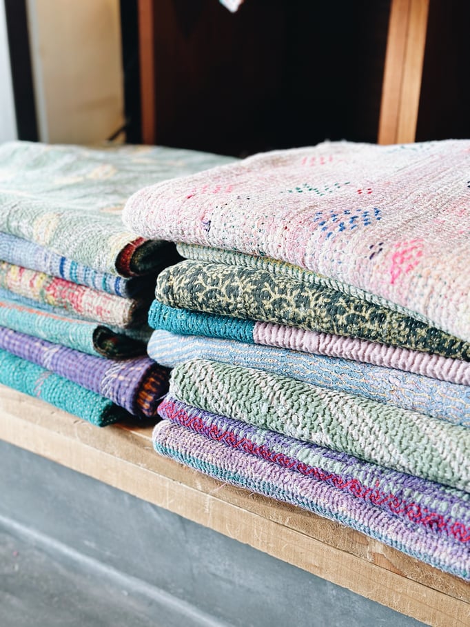 インドの東部 ベンガル地方を中心に古くから伝わる刺し子刺繍布『Kantha (カンタ)』。ヴィンテージ布を複数枚重ね合わせ、女性たちの手によって一針一針時間を掛けて丁寧に仕上げられた"全て一点もの"です。