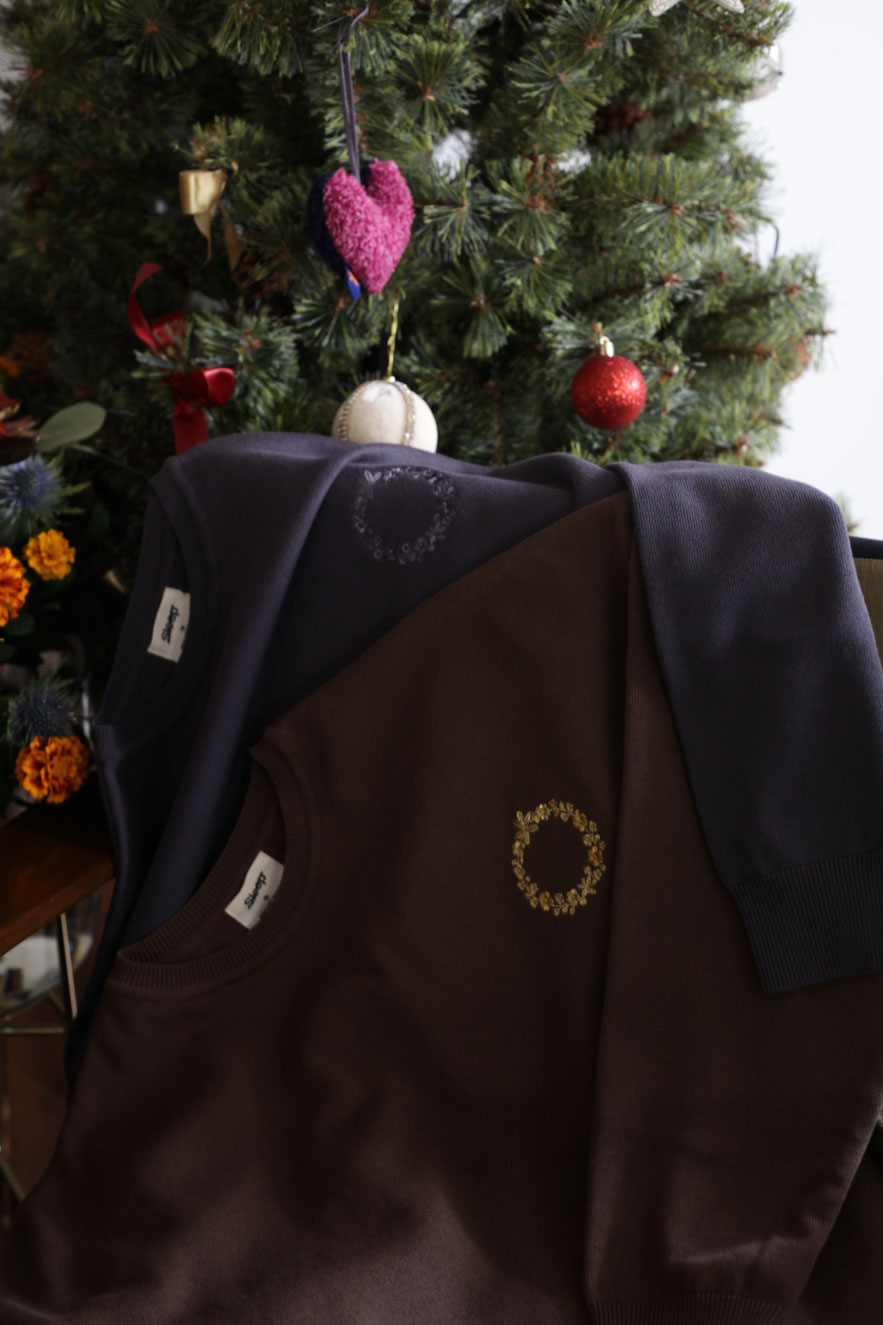 眠家のオリジナルブランド “DON’T SLEEP” からは、 定番のコットンニットにDaylilyのサークルフラワーを刺繍した特別モデルをリリース。