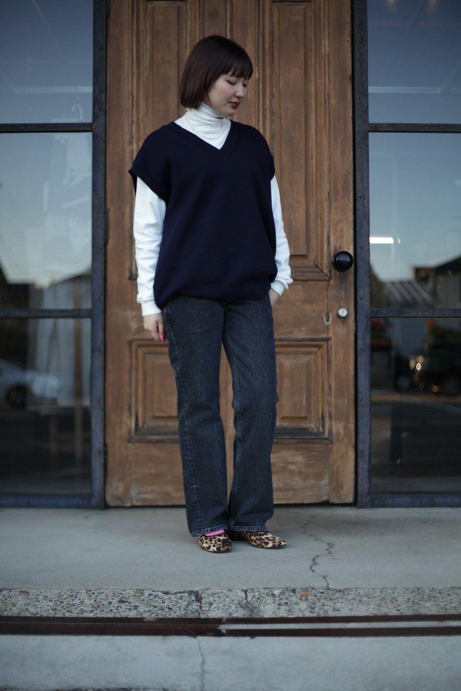 暖冬だとアウターを脱ぐ時間が長い日も多く、ロンTや薄手ニットだけだと物足りない場面でも、ベストがあれば一枚で整う印象になります。