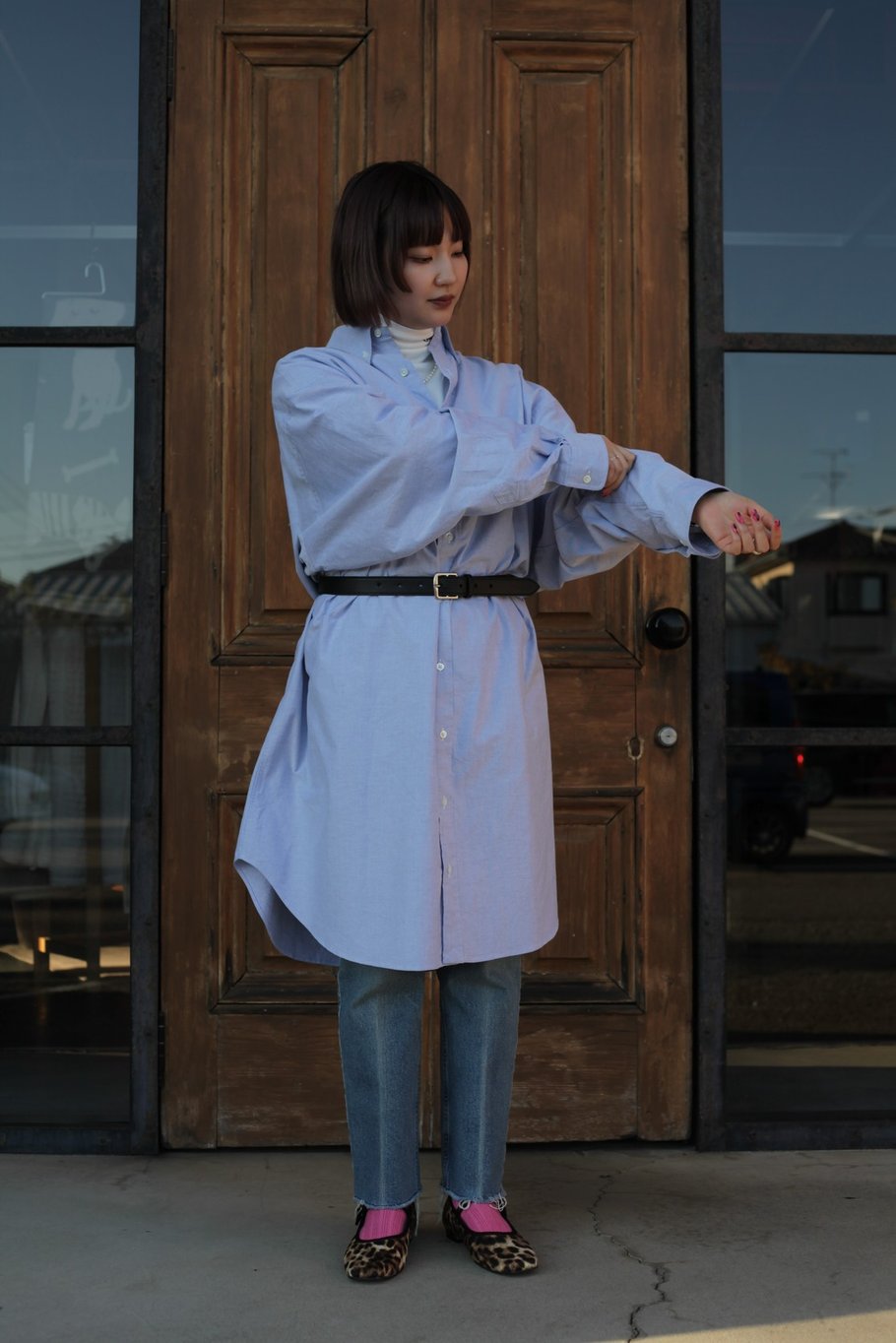 淡いブルーのオックスフォードシャツは、冬の暗い色のアウターと合わせてもバランスが取りやすい色です。