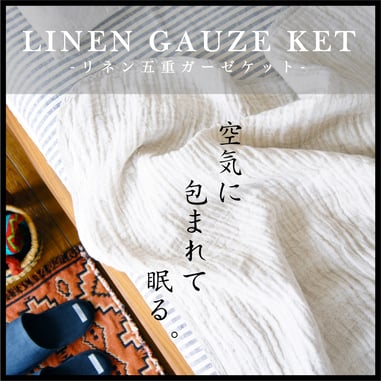 リネン素材特有の通気性や柔らかさを活かした極薄のガーゼ素材を5枚重ね合わせる事で、絶妙なふんわり感の空気の層が作られ、湿気を発散し蒸れない、これまでのタオルケットにない快適さを持つ“リネン5重ガーゼケット”。